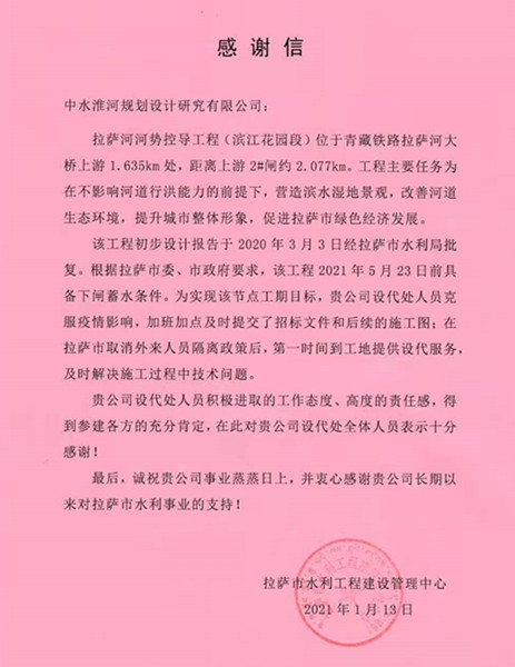 近日,公司收到拉薩市水利工程建設(shè)管理中心發(fā)來(lái)的感謝信,來(lái)信對(duì)我公司拉薩河勢(shì)控導(dǎo)工程(濱江花園段)設(shè)代處能夠克服新冠疫情影響、按時(shí)按質(zhì)提交設(shè)計(jì)文件、主動(dòng)跟進(jìn)現(xiàn)場(chǎng)提供技術(shù)服務(wù)的積極進(jìn)取的工作態(tài)度和高度責(zé)任感表示充分肯定,對(duì)公司長(zhǎng)期以來(lái)對(duì)拉薩水利事業(yè)的支持表示衷心感謝。