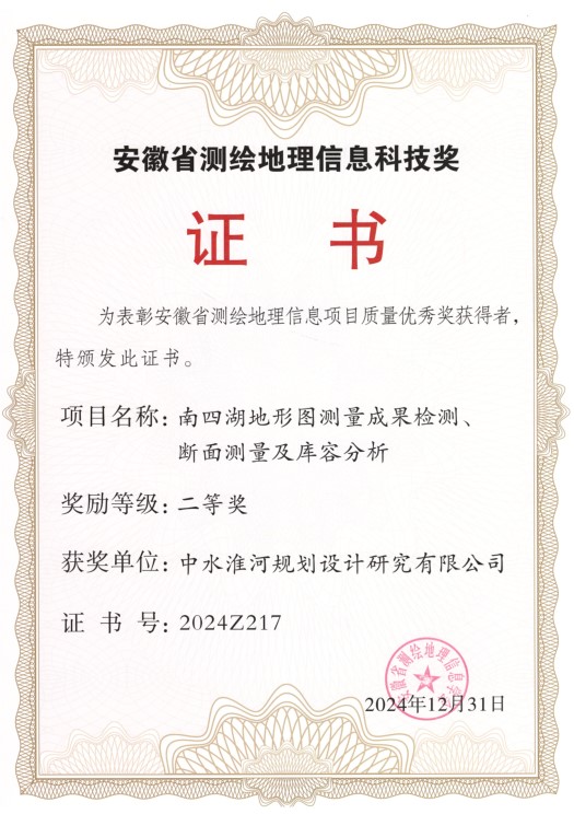 近期,安徽省測繪地理信息學(xué)會發(fā)布《2024年度安徽省測繪地理信息科技獎勵評審結(jié)果公告》,公司申報(bào)的《南四湖地形圖測量成果檢測、斷面測量及庫容分析項(xiàng)目》榮獲項(xiàng)目質(zhì)量優(yōu)秀獎二等獎。